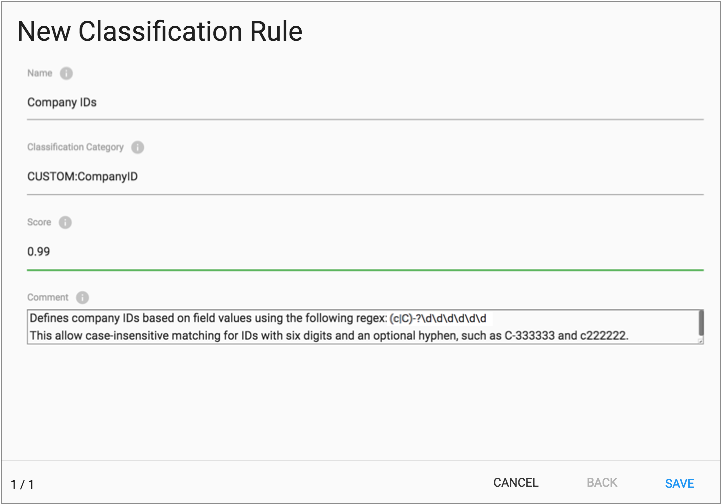 For example, the following classification rule uses a category of CUSTOM:CompanyID and a score of .99 because we are confident that the classifiers that we create will capture all company IDs.