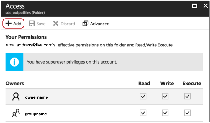 To allow the Azure Data Lake Storage (Legacy) destination to write to Microsoft Azure Data Lake Storage Gen1, grant execute permission to the Data Collector web application for the folders that you want to use. When using directory templates in the destination, be sure to include all subfolders.