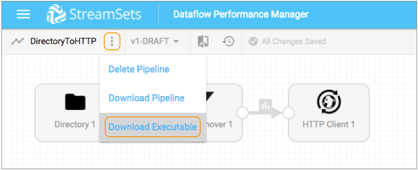 From the edge pipeline canvas, you can download the SDC Edge executable along with the edge pipeline open in the canvas. Download and install the edge executable if you want to locally run the pipeline on SDC Edge.