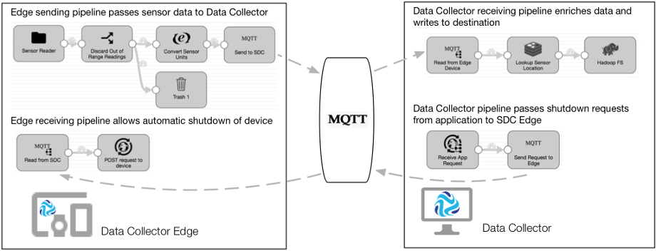 - To allow the automatic shutdown of the edge devices, each SDC Edge installed on each machine tool also runs an edge receiving pipeline. The edge pipeline includes an MQTT Subscriber origin that listens to the sensor ID topic written to by the Data Collector pipeline. The edge pipeline uses an HTTP Client destination to send the POST request to an HTTP resource URL, instructing the machine to shut itself down.