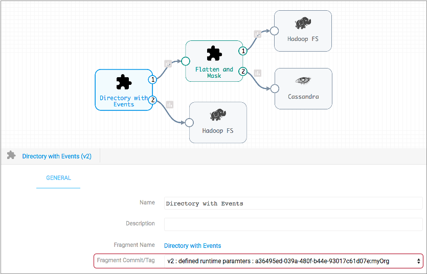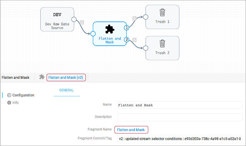 To view or change the fragment version used in a pipeline, select the fragment, then configure the Fragment Commit/Tag property as needed:
