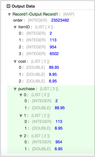 In the Purchase field, the merged data is a list of Map fields. Each map has the field name and value in the ItemID list merged with the corresponding field name and value from the Cost list. Notice that the fourth ItemID, /ItemID/3, is not included in the merged list because it has no corresponding cost information.