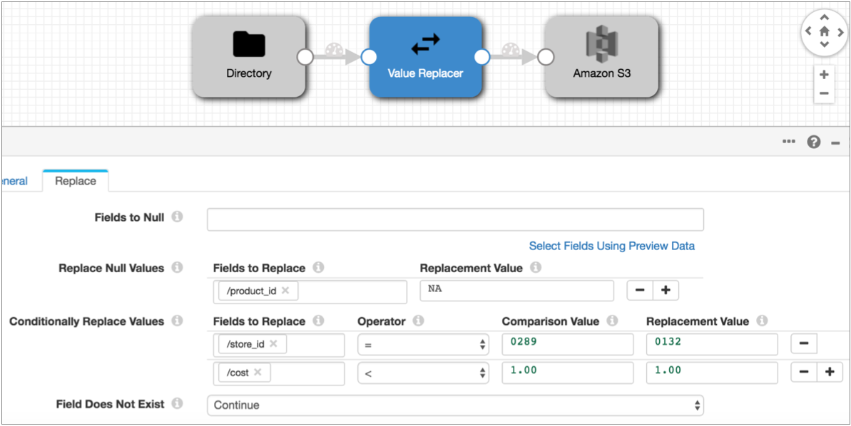 For example, in the following Value Replacer, the processor first replaces null values in the product_id field, then replaces the "0289" store ID with "0132". And finally, it replaces values less than 1.00 in the cost field with "1.00":