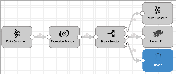 For example, the following pipeline uses the Stream Selector to route data to the Kafka Producer and Hadoop FS targets based on different conditions. The Stream Selector routes all records that are not included in either of the other conditions to the Trash destination.