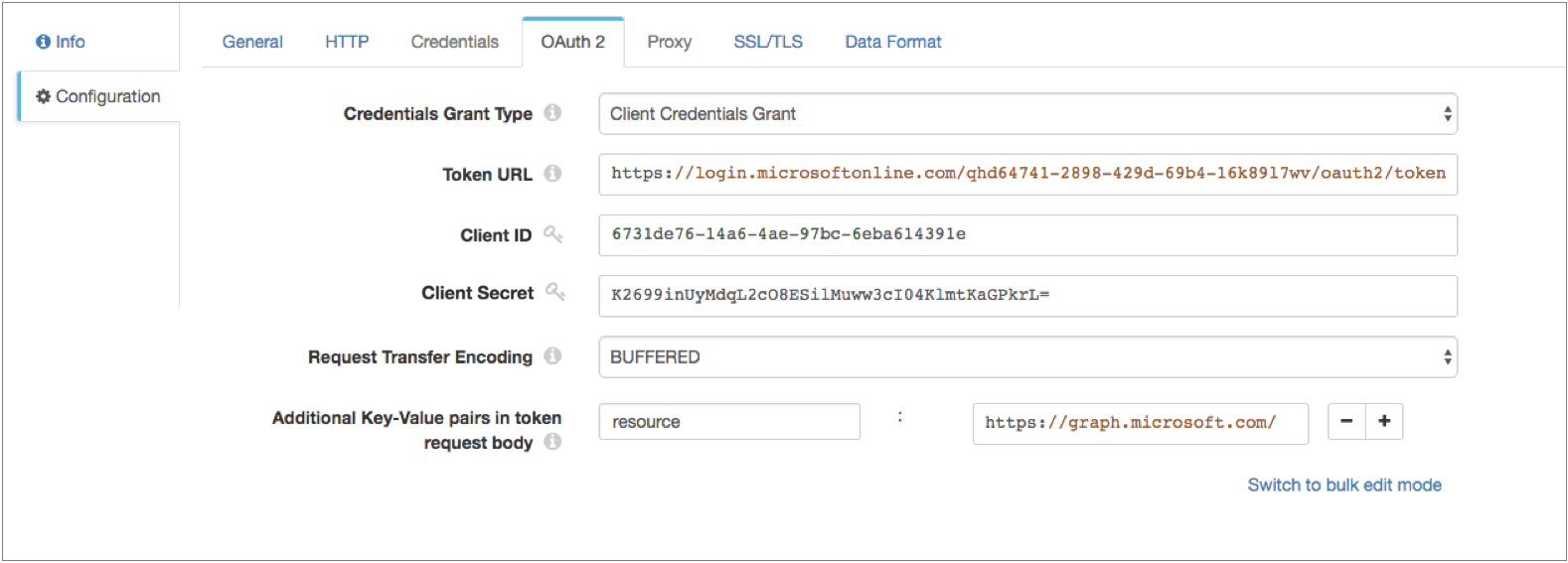 To use OAuth 2 authorization to read from Microsoft Azure AD, configure HTTP Client to use no authentication and the client credentials grant.