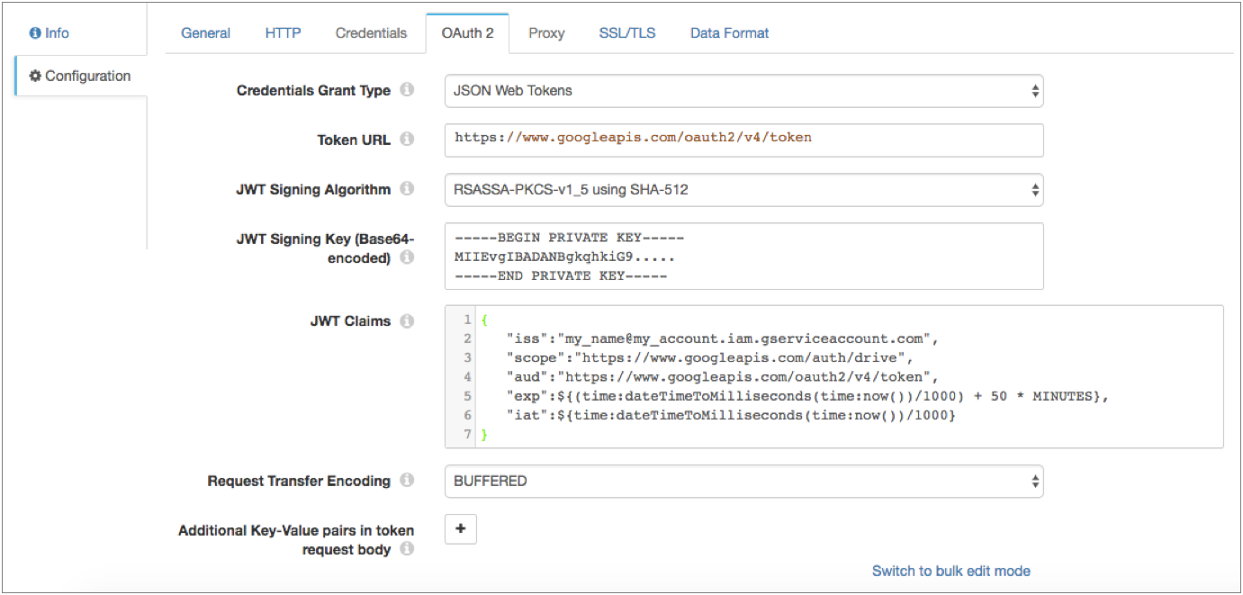 To use OAuth 2 authorization to read from Google service accounts, configure HTTP Client to use no authentication and the JSON Web Tokens grant.