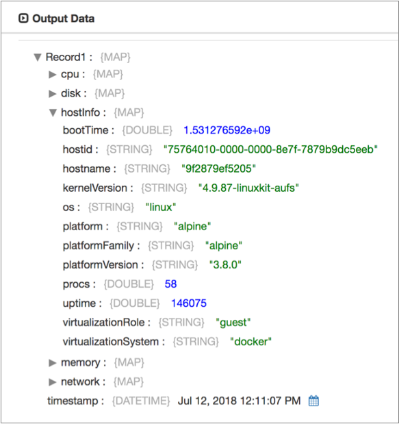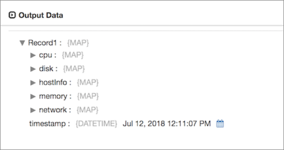 Each batch contains a single record that includes the timestamp when the data was read and a map field for each selected system metric type. When you configure the origin, you select the types of system metrics to read - including host information and CPU, memory, disk, network, and process metrics.