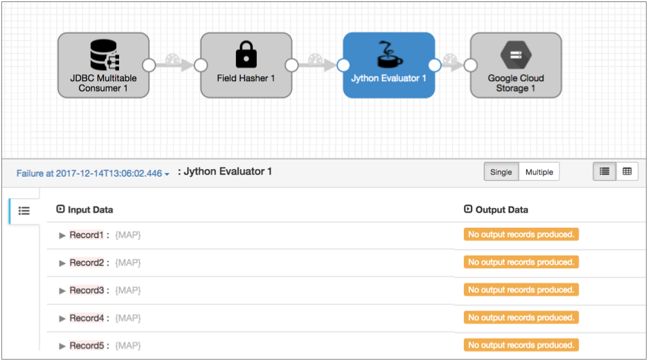 You can click through the pipeline starting from the origin, looking for the problematic stage and finding no data. But from the error message, you can tell that there was a problem with a scripting processor. So you can look immediately at the scripting processor. There, you find that the offending data enters the processor but does not exit: