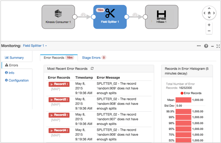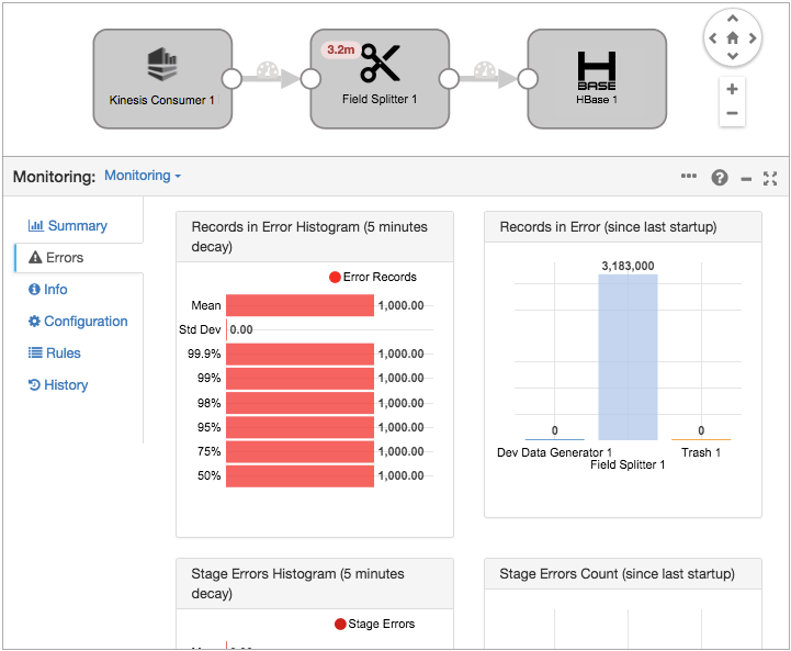 - For a pipeline, displays histograms for the number of error records by five minute decay and the number of error records by stage since the pipeline started.