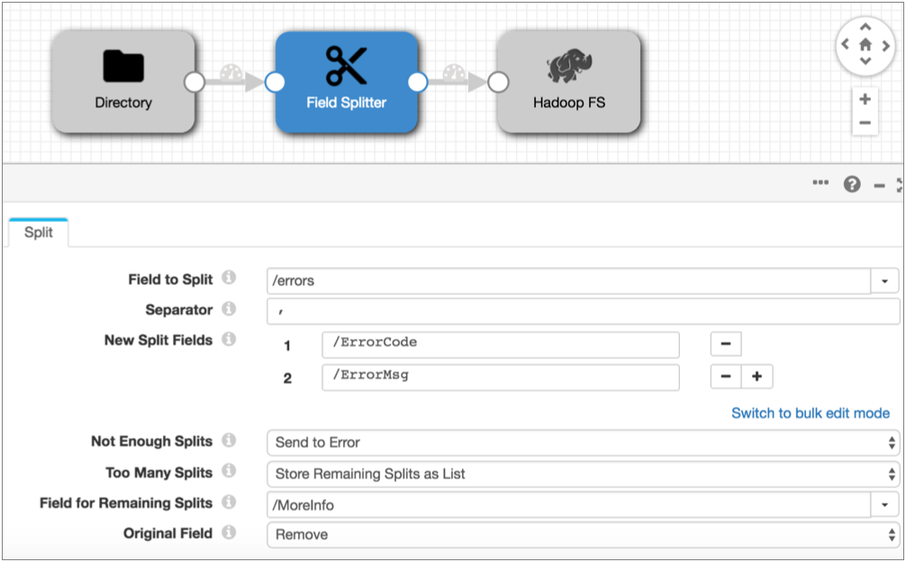 When you configure the Field Splitter, you specify the field to split, the regular expression to use as a separator, and the fields to use for split data. You configure what to do when a record does not have the expected number of splits, and what to do when a record has additional data with more possible splits.