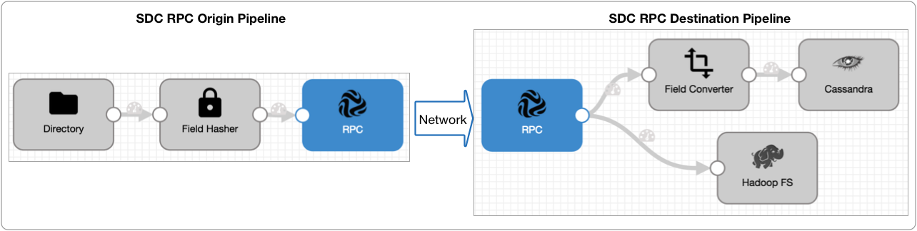 The SDC RPC destination and SDC RPC origin enable you to pass data securely from one pipeline to another, effectively like creating a single pipeline that spans a network.