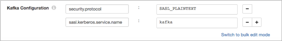 - On the Kafka tab, add the security.protocol Kafka configuration property, and set it to SASL_PLAINTEXT.
