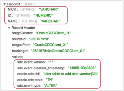 For example, the following ALTER event record displays the three fields in an updated schema - NICK, ID, and NAME: