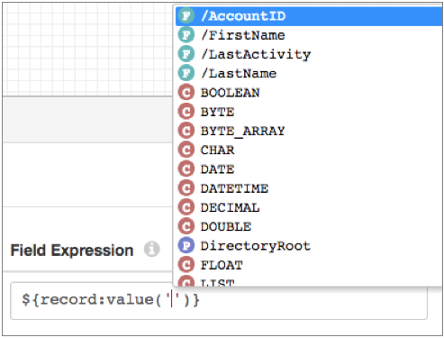 Expression completion provides a list of data types, runtime parameters, fields, and functions that you can use. The list includes runtime parameters when defined, and available fields when the pipeline is valid for data preview.