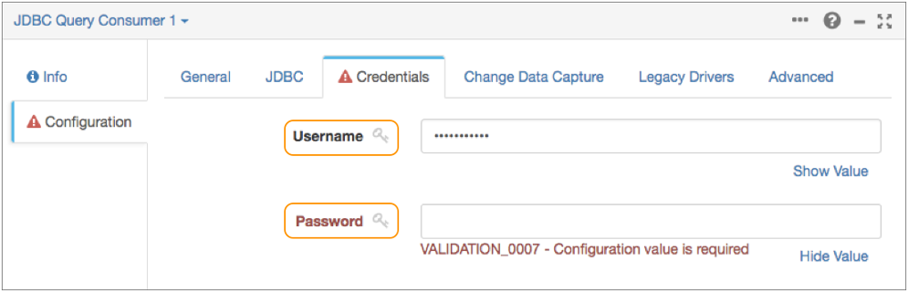 If you enter credential values directly in stage properties, you expose the credentials to any user with access to the pipeline. To access external systems without exposing the credentials, define credentials in a credential store and then use the Data Collector credential functions in the stage properties to retrieve those values.