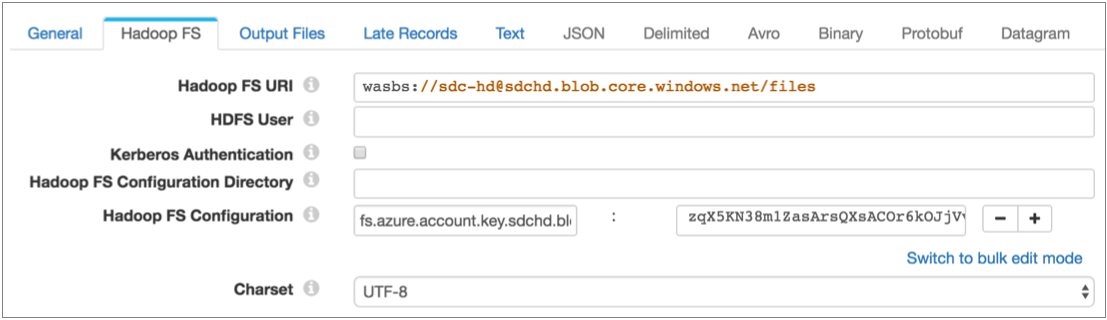 core-site.xmlfile, use a Hadoop FS configuration property to pass the Azure credentials:- In the destination, on the Hadoop FS tab,