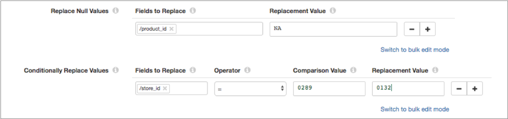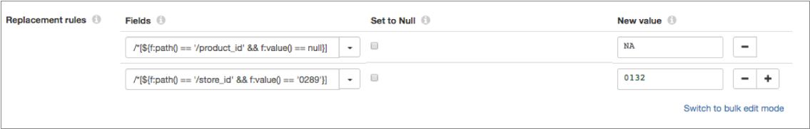 For example, let's say that your Value Replacer processor is configured to replace null values in the product_id field with "NA" and to replace the "0289" store ID with "0132" as follows:
