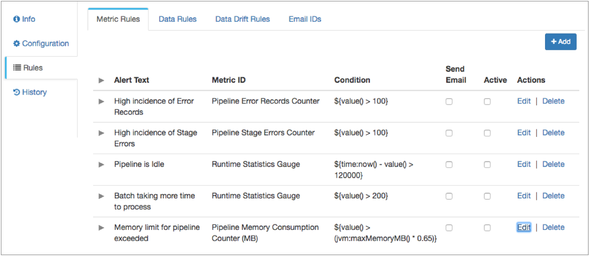 - Metric rule - Gathers statistics about the pipeline such as pipeline idle time or error record counts. Provides an alert when enabled.