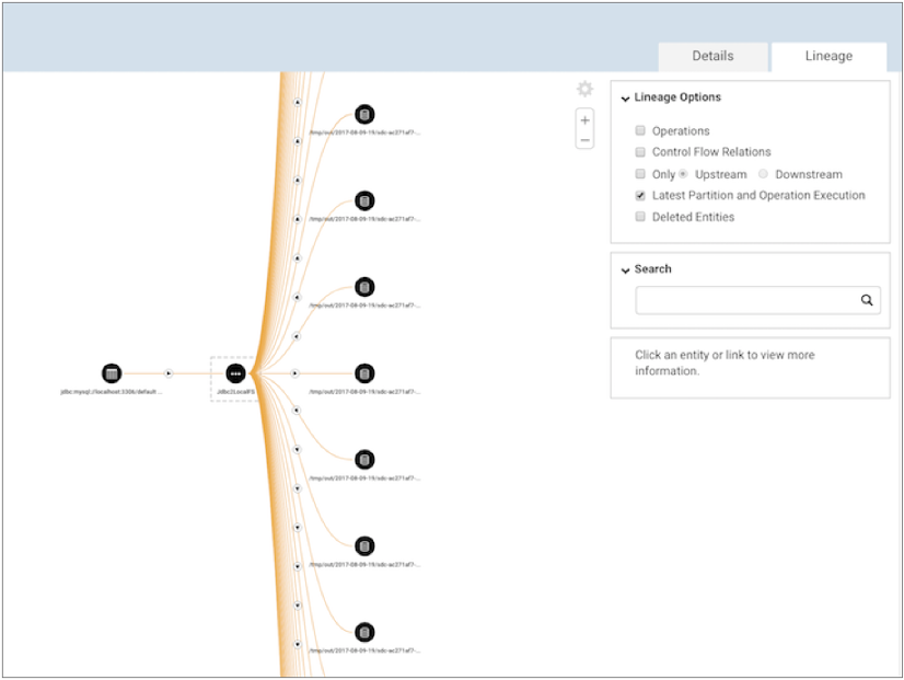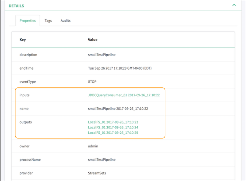 For example, let's assume that you run a pipeline that includes a JDBC Query Consumer origin and a Local FS destination. Cloudera Navigator displays a single input representing the JDBC Query Consumer origin. As the pipeline runs, the Local FS destination creates multiple output files. Cloudera Navigator displays multiple outputs, each output representing one of the generated output files.