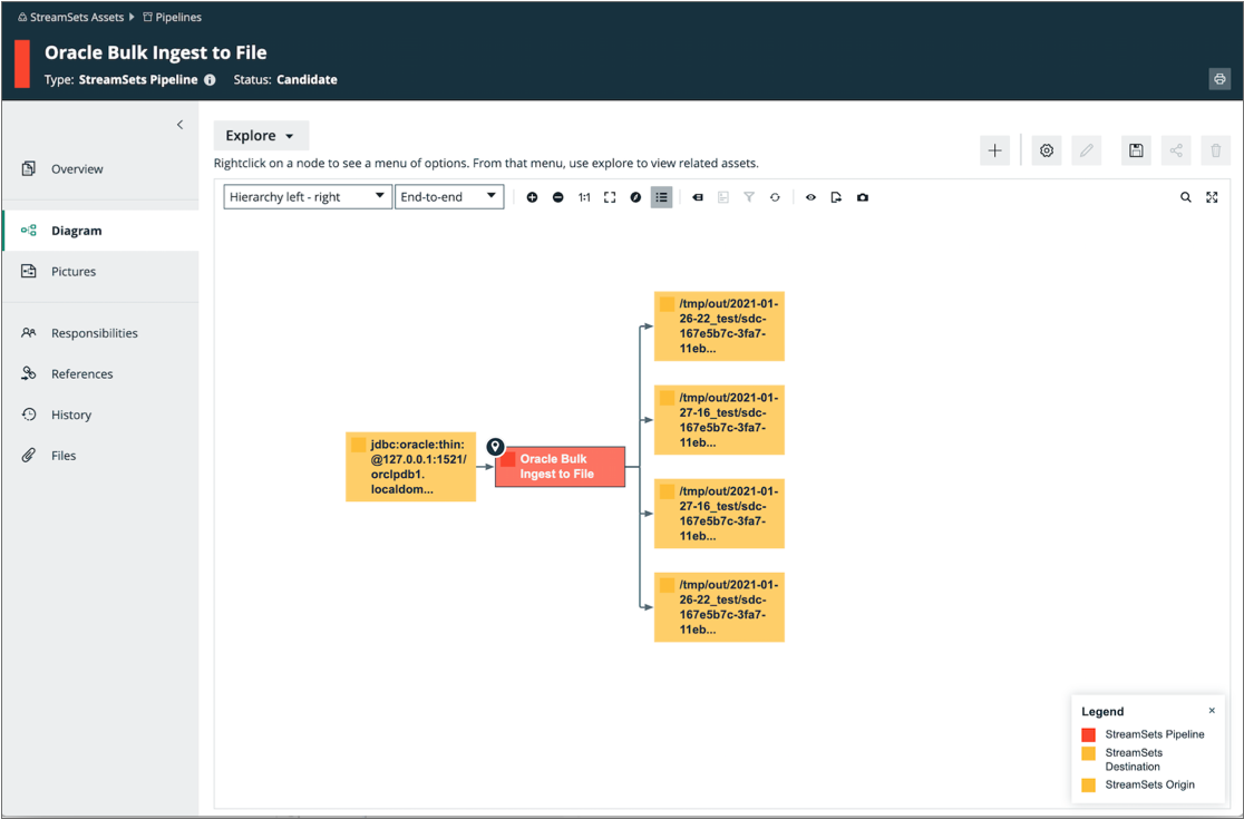 For example, say you run a pipeline that includes an Oracle Bulkloader origin and a Local FS destination. Collibra displays a single input representing the origin. As the pipeline runs, the Local FS destination creates multiple output files. Collibra displays multiple outputs, each output representing one of the generated output files.