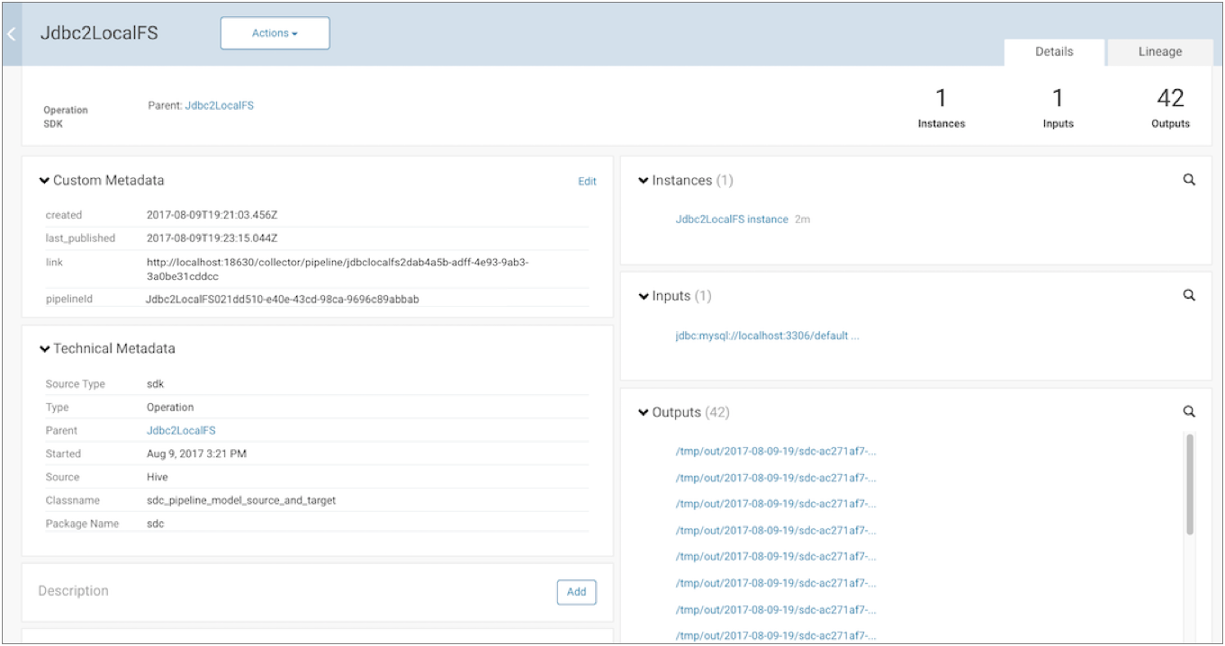 Cloudera Navigator displays the details of the published pipeline metadata as follows. Note how our example Jdbc2LocalFS pipeline is listed with 1 input and 42 outputs - one output for each generated output file: