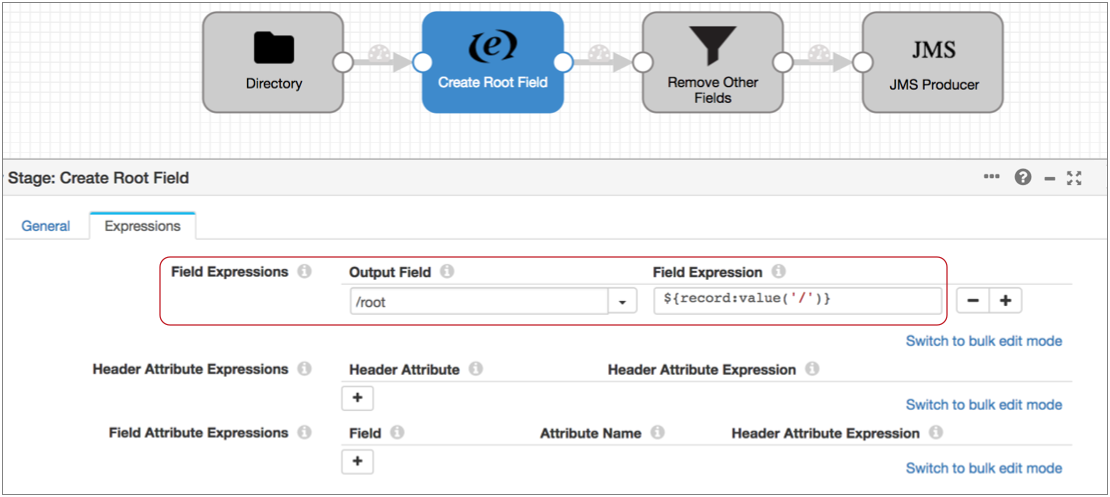 For example, in the following pipeline, the Expression Evaluator uses the expression, ${record:value('/')}, to create a root field and copy the entire record under the root field: