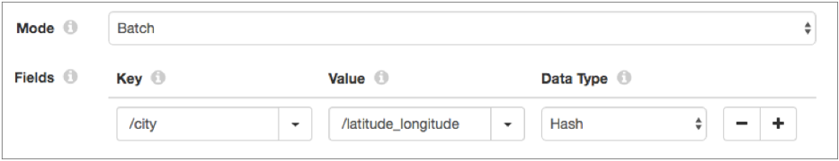 When you configure the destination for batch mode, you select the incoming fields to use as the Redis key and value. You also select the data type of the Redis value. If needed, the Redis destination converts the Data Collector data type of the incoming value field to the selected Redis data type.