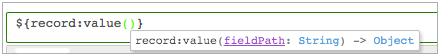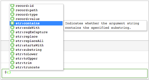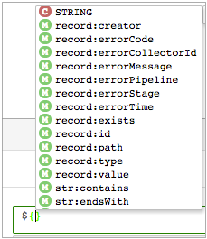 Expression completion provides a list of functions and other elements of the StreamSets expression language that are valid for use at that location. The list includes any runtime parameters that are defined for the pipeline, and available fields when the pipeline is valid for data preview.