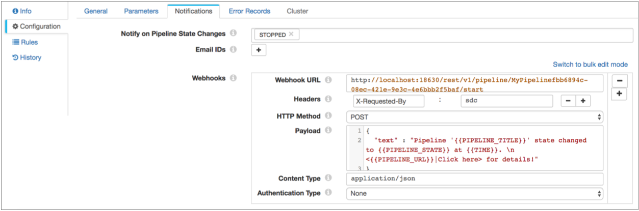 pipeline transitions to the selected pipeline states. For example, you can send an HTTP request to the Data Collector REST API to start a different pipeline when the current pipeline transitions to a Finished state. For details on how to configure a state notification webhook, see the Notifications properties in Configuring a Pipeline. |