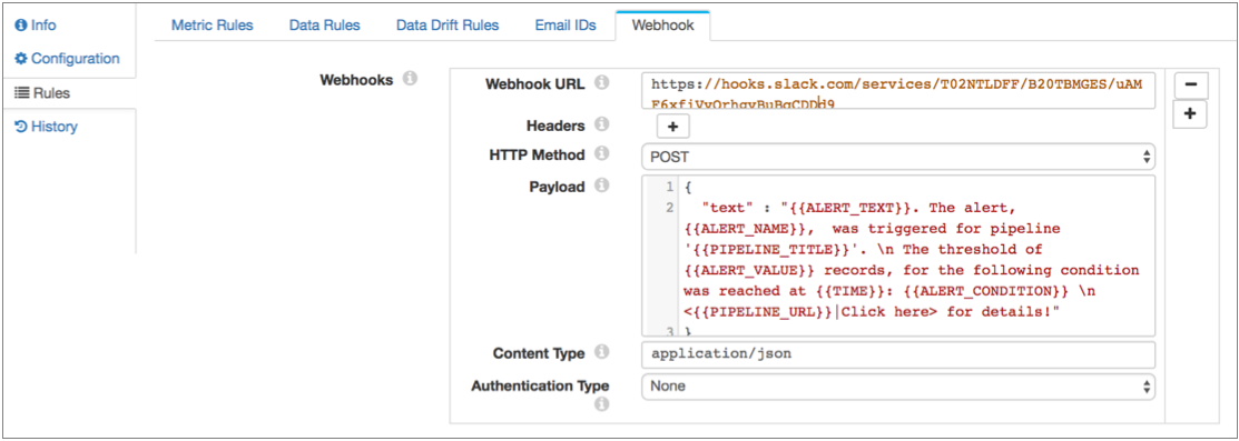 triggered. For example, if your text message application has a webhook API, you can have the pipeline send texts when alerts are triggered. For details on how to configure an alert webhook, see Configuring an Alert Webhook. |