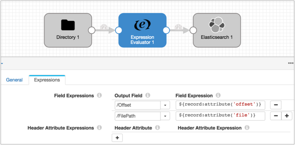${record:attribute('<attribute name>')}For example, the following Expression Evaluator adds the file and offset record header attributes created by the Directory origin to the record: