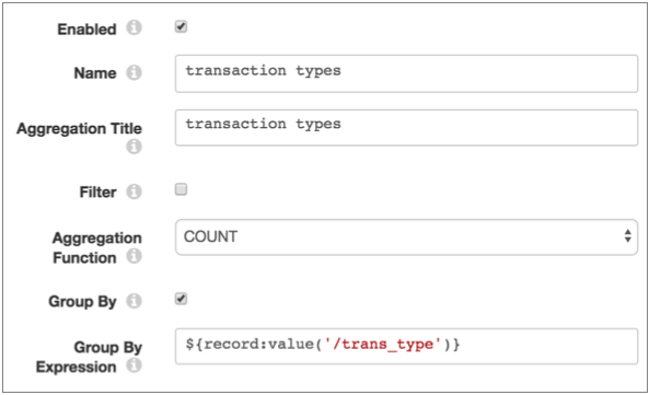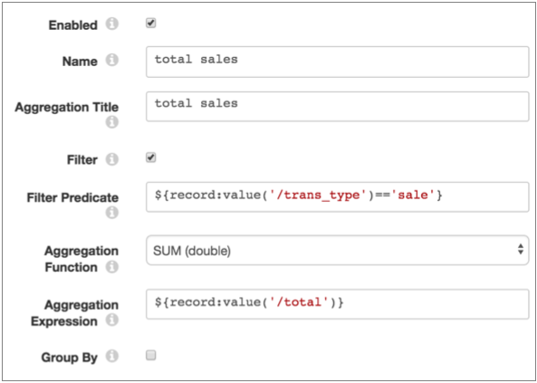 When you configure an aggregation, you specify the aggregation name and display title and the aggregation function to use. You can optionally define a filter expression to process a subset of the data, and a group by expression to aggregate based on groups.
