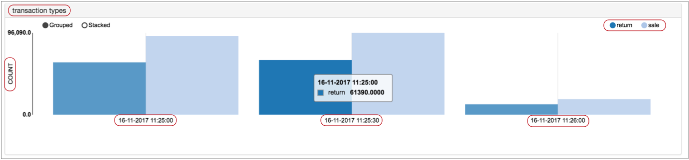 In the resulting "transaction types" chart, the COUNT function displays on the left, and separate bars represent the return and sale groups: