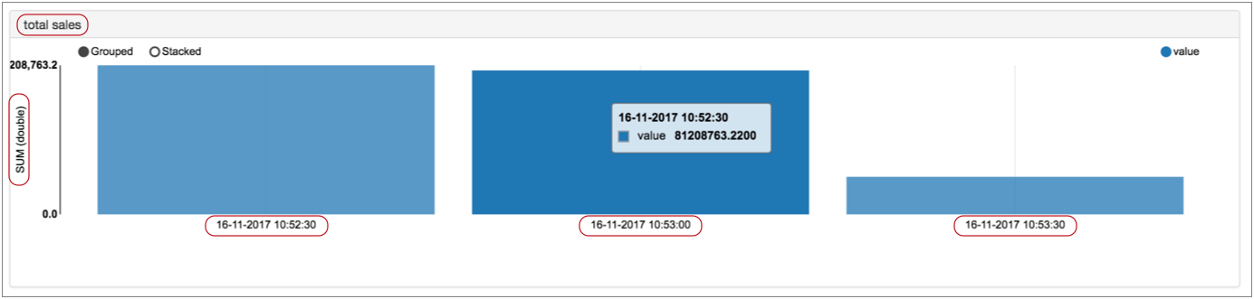 Notice, the aggregate function, SUM (double), displays on the left side of the chart and the end of each time window displays under each bar. You can see that the interval between the time windows is 30 seconds, as configured in the stage.