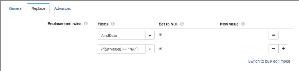 For example, the following configuration includes two replacement rules. The first rule sets all values in the endDate field to null values. The second rule uses a field path expression to conditionally set only field values with a value of "NA" to null values: