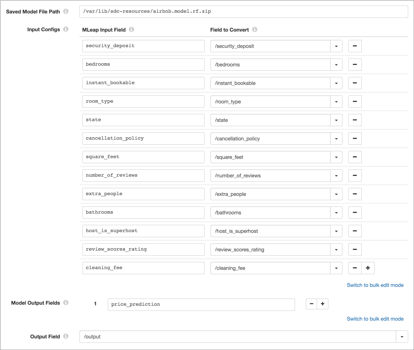 When you configure the MLeap Evaluator processor, you define the path to the saved MLeap bundle stored on the Data Collector machine. You also define mappings between fields in the record and input fields in the model, and you define the model fields to output and the record field to store the model output.