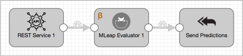 For example, in the following microservice pipeline, a REST API client sends a request with input data to the REST Service origin. The MLeap Evaluator processor uses a machine learning model to generate predictions and passes records that contain those predictions from the model to the Send Response to Origin destination, labeled Send Predictions, which sends the records back to the REST Service origin. The origin then transmits JSON-formatted responses back to the originating REST API client.