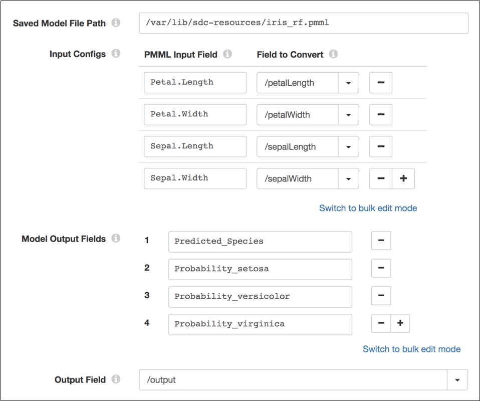 When you configure the PMML Evaluator processor, you define the path to the saved PMML document stored on the Data Collector machine. You also define mappings between fields in the record and input fields in the model, and you define the model fields to output and the record field to store the model output.