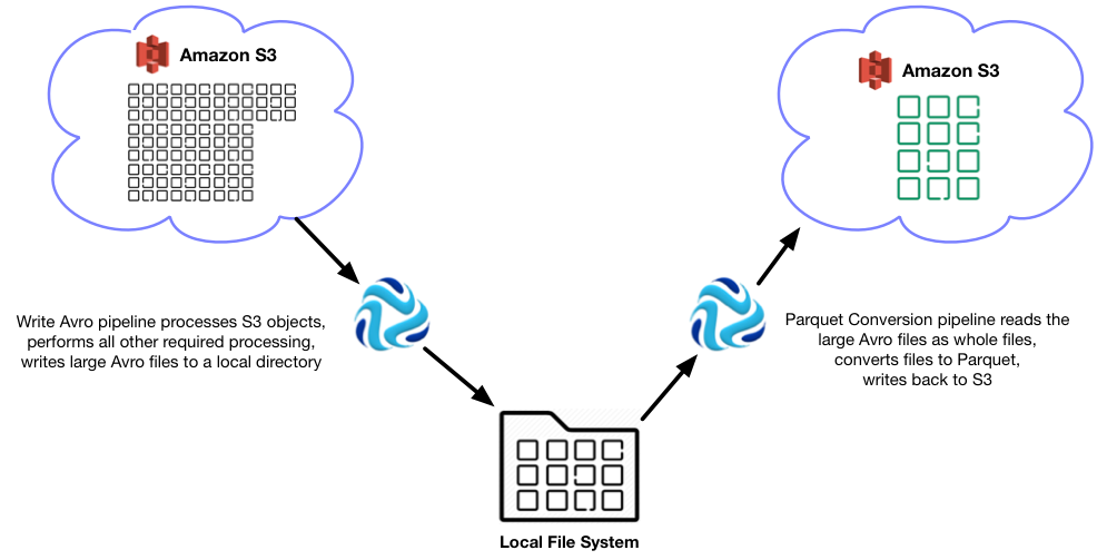 To do this, we set up two pipelines. The first pipeline reads the Amazon S3 objects and writes large Avro files to a local file system. This is the Write Avro pipeline. The second Parquet Conversion pipeline reads the Avro files as whole files and transforms each file to a corresponding Parquet file, which is written back to S3.