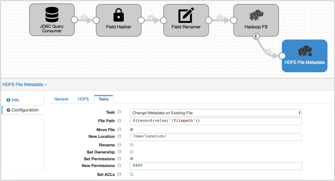 3. Configure the HDFS File Metadata executor to move the files to the directory that you want and set the permissions for the file.