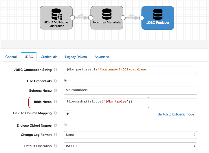jdbc.tablesrecord header attribute. If you want to write records to tables of the same name, you can use${record:attribute('jdbc.tables')}for the table name property.Similarly, the JDBC Query Consumer writes the originating table name in a