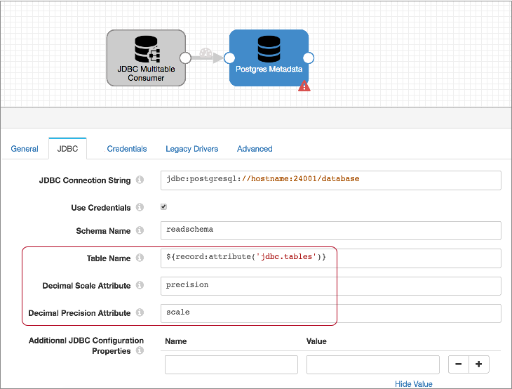 Tip: You might set up runtime parameters for the JDBC URL to make configuring the PostgreSQL Metadata processor and the JDBC Producer easier. To secure sensitive information such as user names and passwords, you can use runtime resources or credential stores. - Configure the schema name and table name.