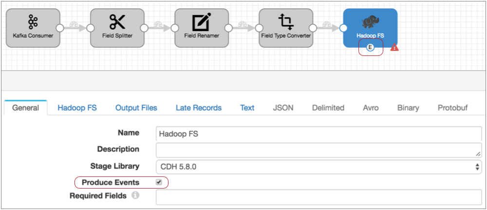 The Hadoop FS destination generates events each time it closes a file. This is perfect because we want to convert files to Parquet only after they are fully written.