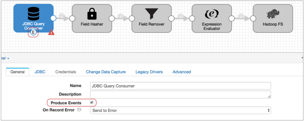 On the General tab of the JDBC Query Consumer origin, select the Produce Events property.
