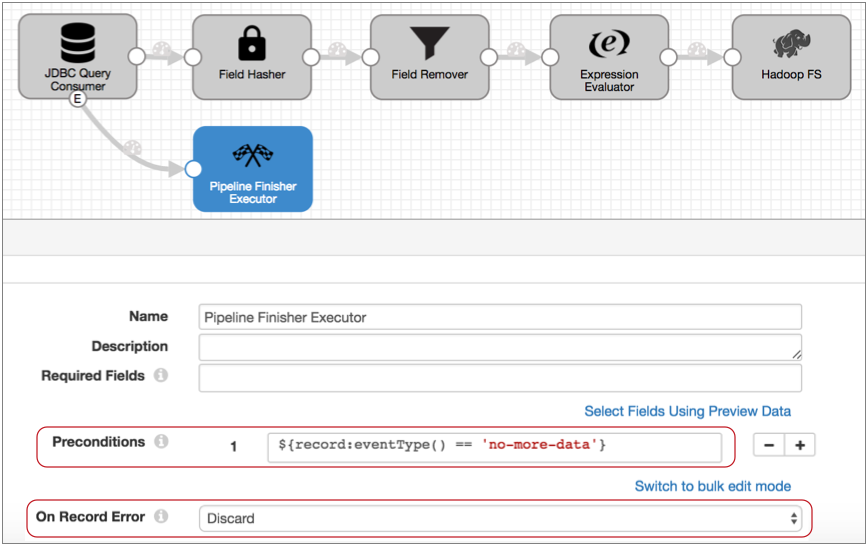At this point, all events that the origin generates come to the executor. Since the JDBC Query Consumer origin generates multiple event types, this setup might cause the executor to stop the pipeline too soon.