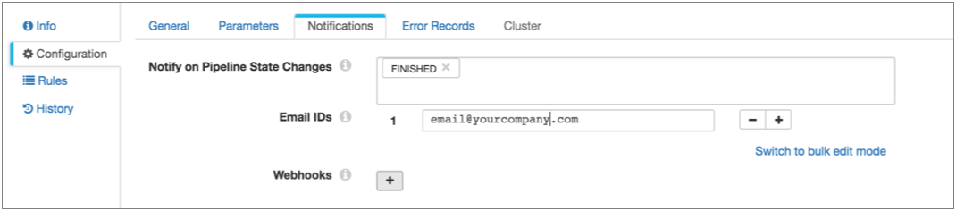 You can use this option when Data Collector is set up to send email. You can alternatively use the pipeline state notification to send a webhook, or use an Email executor in the pipeline to send a customized email. Since we only need a simple notification, let's send a basic email based on the pipeline state: