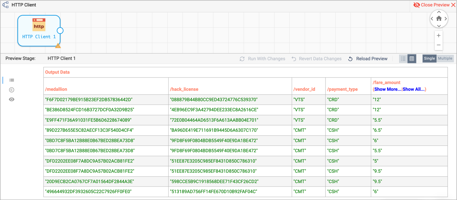 The Preview Panel displays a list of 10 output records for HTTP Client origin in list view. If you drill down a bit, you see that each record displays an ordered list of field names and values with the data type of each field.