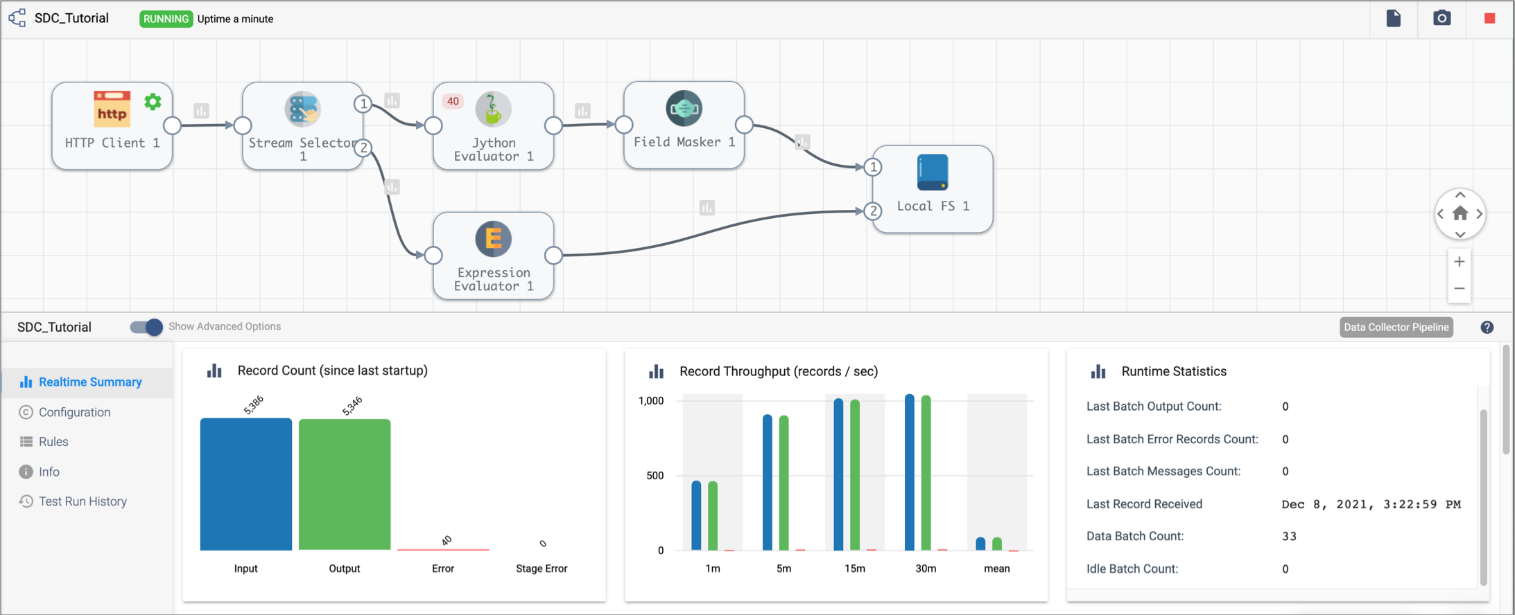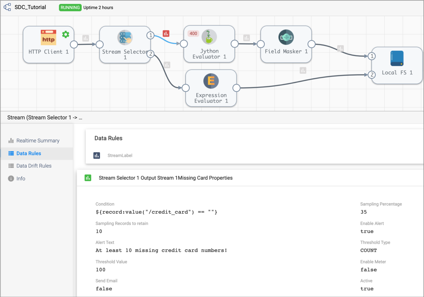 The basic tutorial creates a pipeline that reads a file from an HTTP resource URL, processes the data in two branches, and writes all data to a file system. You'll use data preview to help configure the pipeline, then create a data alert and run the pipeline.