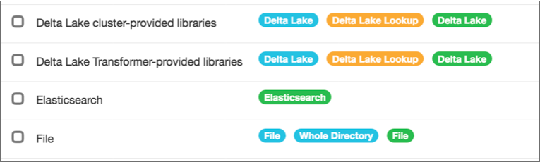 Each stage library lists the stages included in the stage library. For example, the File stage library shown below includes the File and Whole Directory origins, and the File destination: