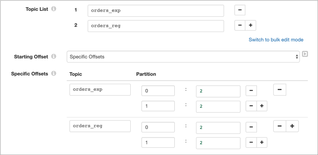 For example, suppose your Kafka topics orders_exp and orders_reg have two partitions, 0 and 1. To have the origin read from the partitions starting with the third message, 2, configure the origin as follows: